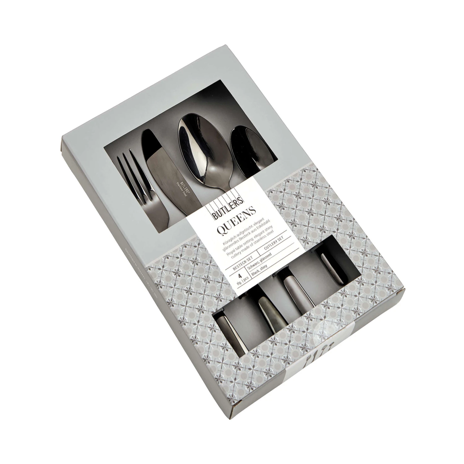 Jetzt wird’s luxuriös, denn das 16tlg. Queens Besteckset bringt majestätischen Charme auf Ihren Tisch. Ob romantisch, verspielt oder luxuriös – das hochwertige Besteckset aus Edelstahl beinhaltet alles was Sie für eine geschmackvoll eingedeckte Tafel brauchen und rundet jeden Stil königlich ab. Sowohl im Alltag als auch zu ganz besonderen Anlässen überzeugt das glänzende Essbesteck durch das schlichte Design und die eleganten Formen. Das exklusive Besteck ist auch in Gold, Schwarz oder Silber erhältlich.