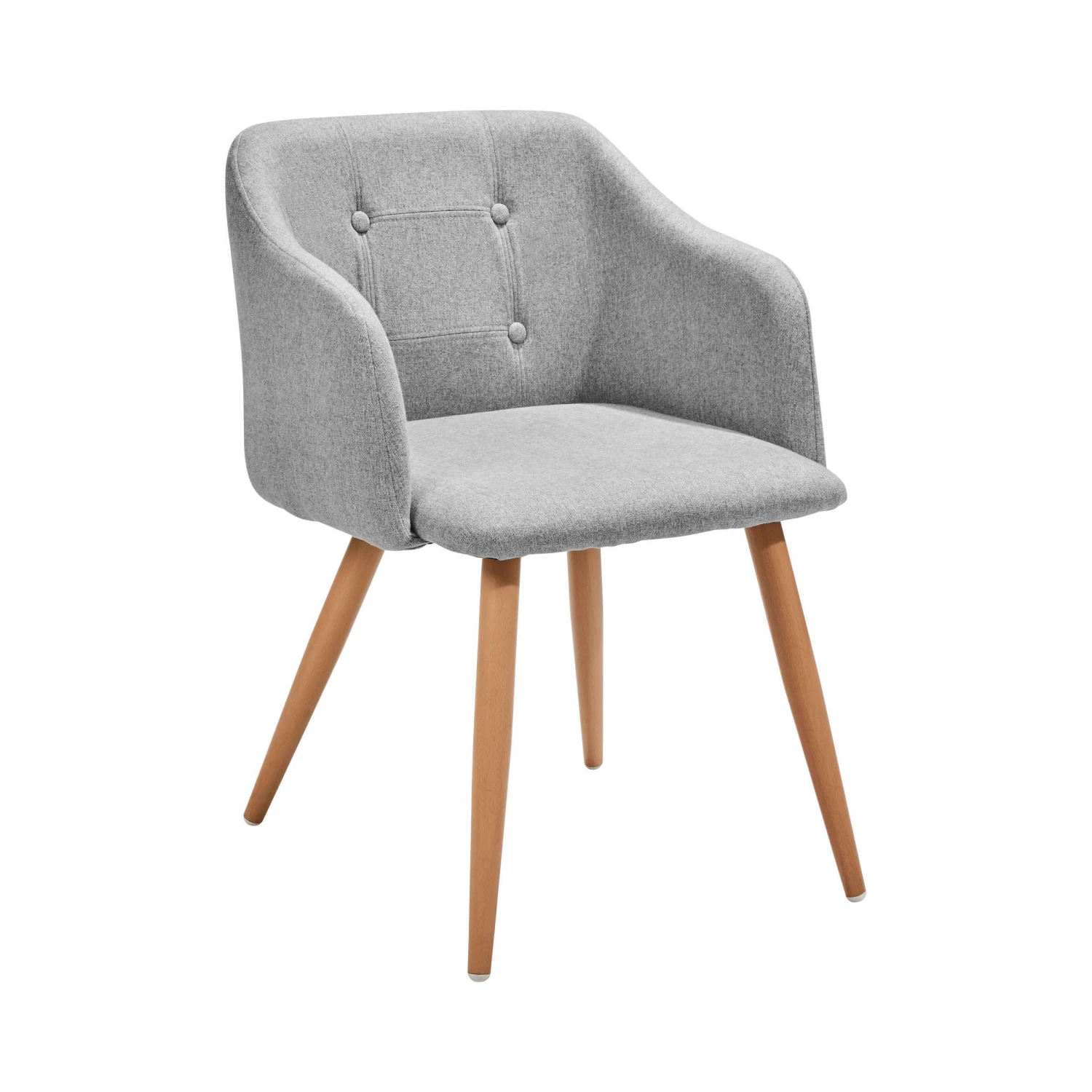 Bequemes Sitzen und stylisches Design in einem: Alles passt perfekt beim Rock ’n‘ Soul-Stuhl. Vom pflegeleichten grauen Filzbezug auf dem gepolsterten Sitz über die komfortablen Armlehnen und Knöpfe in der Rückenlehne bis zu den nach unten hin zulaufenden Metallbeinen in Holz-Optik. Mit einem dekorativen Kissen oder einem weichen Lammfell verpassen Sie dieser Sitzgelegenheit zudem einen individuellen Look. Sowohl für das Ess- als auch das Wohn- oder Schlafzimmer ideal.
