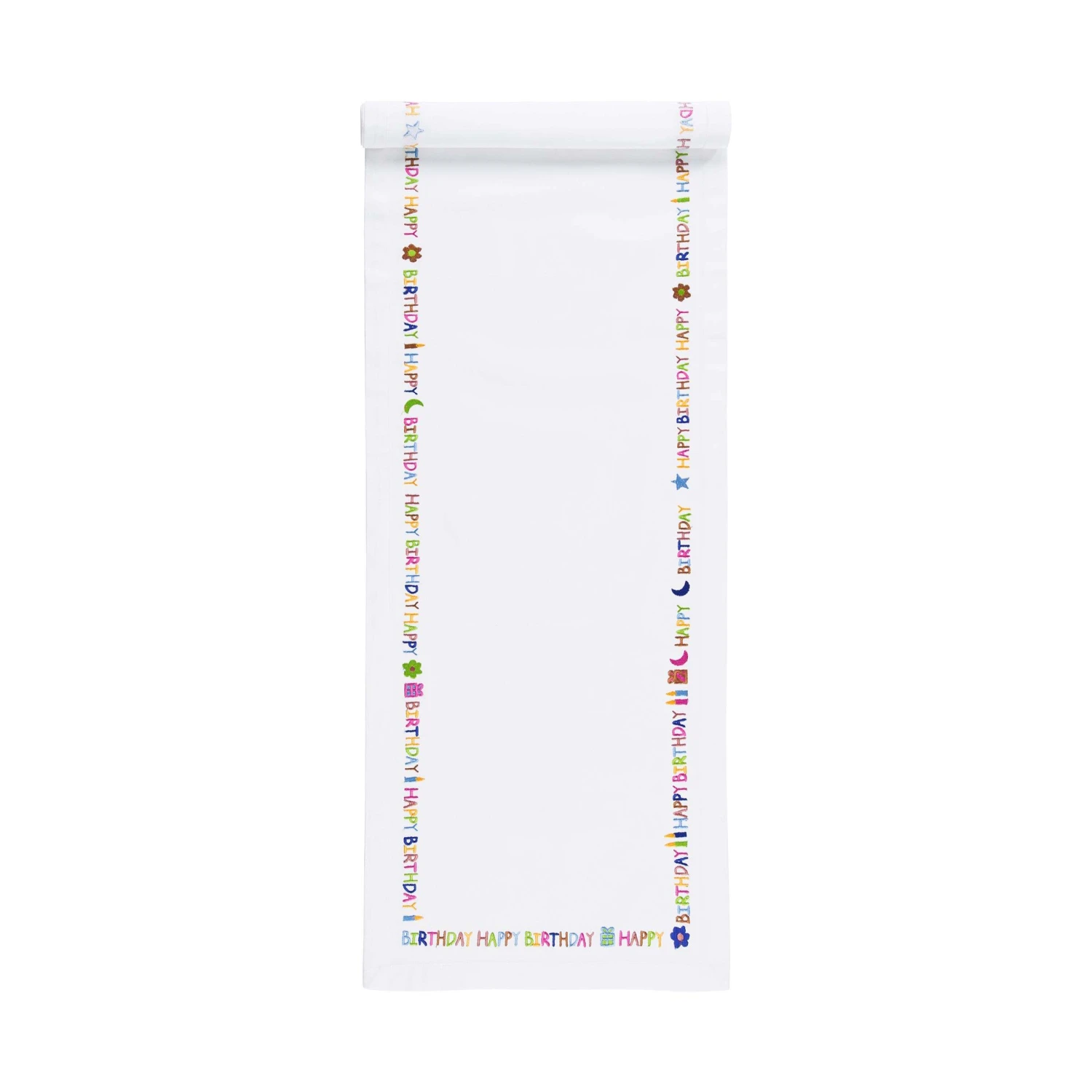 Wer Geburtstag hat, darf sich verwöhnen lassen – mit Glückwünschen, Aufmerksamkeiten und einer fröhlichen Dekoration. Dieser leichte Tischläufer aus reiner Baumwolle ist umlaufend bunt bestickt: mit den Wörtern „Happy Birthday“, kleinen Blumen, Kerzen, Sternen, Monden und Geschenken. Apropos Geschenke: Die lassen sich perfekt auf dem Tischläufer präsentieren, am besten direkt neben der Geburtstagstorte. Übrigens: Zu diesem Tischläufer sind passende Servietten erhältlich.